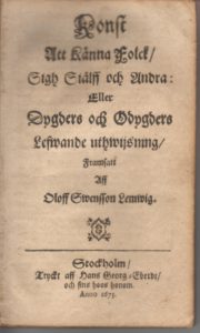 [39] Konst Att Känna Folck, Sigh Siälff och Andra: Eller Dygders och Odygders Lefwande uthwijsning, ITramsatt Aff Oloff Swensson Lemwig. Stockholm, Eberdt, 1673, 8:o, 118 sid.