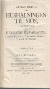 1.1. Afhandling, om hushålningen til siös, i afseende på hälsans bevarande. Til kongl. örlogs-flottans tienst. Författad af Arvid Faxe. … Med kongelig majestets nådigste privilegio. Carlscrona, tryckt i kongelig amiralitets boktryckeriet. År 1782. Karlskrona, 1782.  [08] , 200 s.