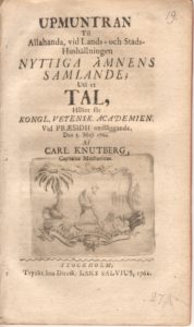 KNUTBERG, CARL. 1712-80 Upmuntran til allahanda, vid lands- och stadshushållningen nyttiga ämnens samlande; uti et tal, hållet för Kongl. Vetensk. Academien, vid præsidii nedläggande, den 5. maji 1762. Stockholm, Lars Salvius, 1762. 26 s. titelblad med graverad vinjett