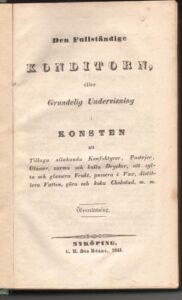 Den fullständige konditorn, eller grundelig undervisning i konsten att tillaga allahanda konfektyrer, pastejer, glasser, varma och kalla drycker, att sylta och glassera frukt, pussera i vax, distillera vatten, göra och koka choklad, m.m. / [öfvers. af Maria Lindeberg]. Nyköping, C.H. Des Réaux. 1841. [4], 299, [10] s. förekommer ibland i ett grönt blindpressat klotband (Mittex 2.299,10s.)  .